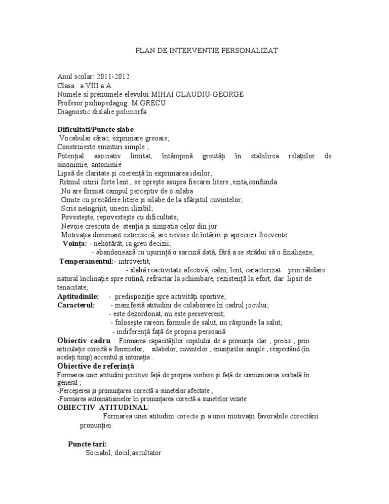 vizitati articolul complet aici : https://biblioteca.regielive.ro/proiecte/psihopedagogie/plan-de-interventie-personalizat-383707.html Programul de interventie personalizat este un instrument de lucru permanent, pentru unul sau mai multi membri ai echipei interdisciplinare care isi coordoneaza. · antrenarea elevei în activităţi matematice distractive pentru a o. Resursele nou adăugate vor fi publicate după ce au fost revizuite.